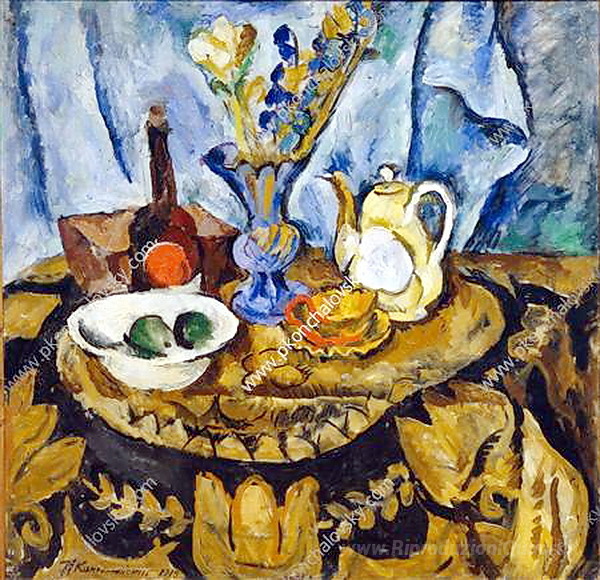 Ti offriamo una riproduzione artigianale su tela dell'opera famosa 'Natura morta con caffettiera' di Pyotr Konchalovsky, dal Museo delle Riproduzioni.