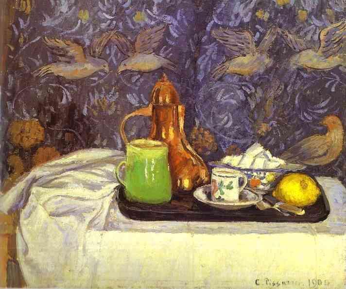 Ti offriamo una riproduzione artigianale su tela dell'opera famosa 'Natura morta con caffettiera' di Camille Pissarro, dal Museo delle Riproduzioni.