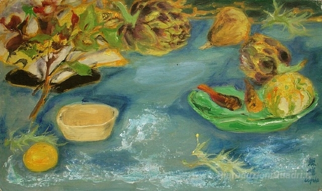 Ti offriamo una riproduzione artigianale su tela dell'opera famosa 'Natura morta con carciofi' di Le Pho, dal Museo delle Riproduzioni.