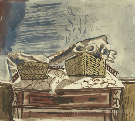 Ti offriamo una riproduzione artigianale su tela dell'opera famosa 'Natura morta con cesti' di Yiannis Tsaroychis, dal Museo delle Riproduzioni.