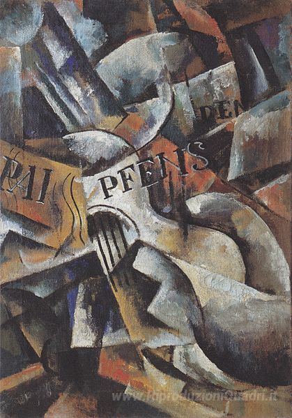 Ti offriamo una riproduzione artigianale su tela dell'opera famosa 'Natura morta con chitarra' di Lyubov Popova, dal Museo delle Riproduzioni.