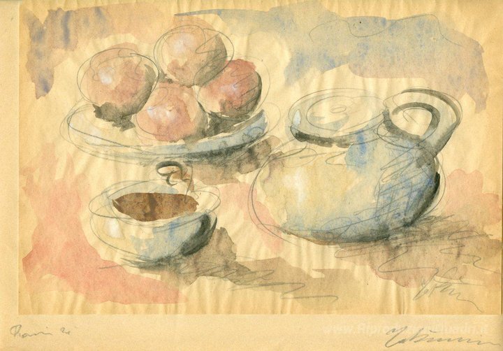 Ti offriamo una riproduzione artigianale su tela dell'opera famosa 'Natura morta con frutta e padelle' di George Bouzianis, dal Museo delle Riproduzioni.