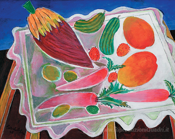 Ti offriamo una riproduzione artigianale su tela dell'opera famosa 'Natura morta con frutta e verdura' di Paritosh Sen, dal Museo delle Riproduzioni.