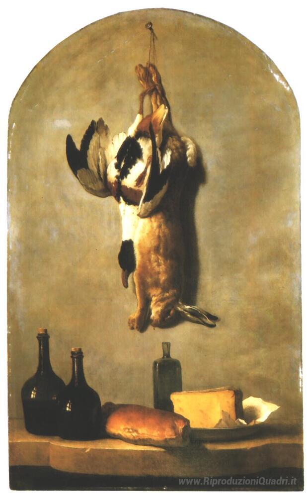 Ti offriamo una riproduzione artigianale su tela dell'opera famosa 'Natura morta con lepre, anatra, pagnotta di pane, formaggio e fi' di Jean-Baptiste Oudry, dal Museo delle Riproduzioni.