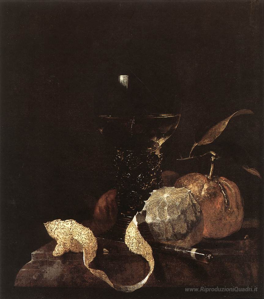 Ti offriamo una riproduzione artigianale su tela dell'opera famosa 'Natura morta con limone, arance e bicchiere di vino' di Willem Kalf, dal Museo delle Riproduzioni.