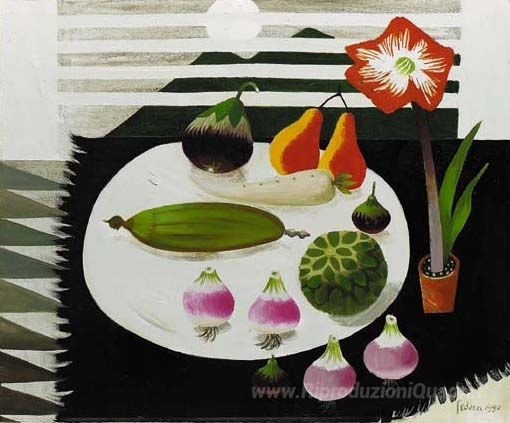 Ti offriamo una riproduzione artigianale su tela dell'opera famosa 'Natura morta con pere e cipolle' di Mary Fedden, dal Museo delle Riproduzioni.