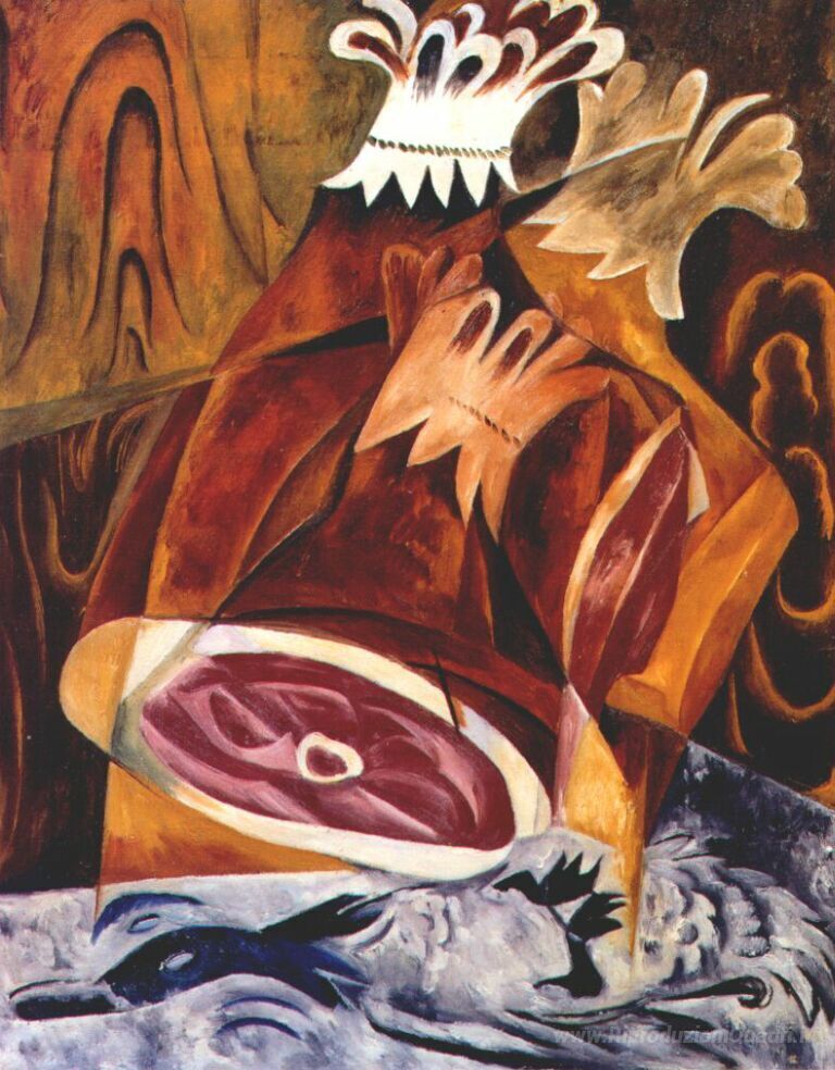 Ti offriamo una riproduzione artigianale su tela dell'opera famosa 'Natura morta con prosciutto' di Natalia Goncharova, dal Museo delle Riproduzioni.