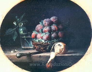 Ti offriamo una riproduzione artigianale su tela dell'opera famosa 'Natura morta con Prugne e un limone' di Anne Vallayer-Coster, dal Museo delle Riproduzioni.