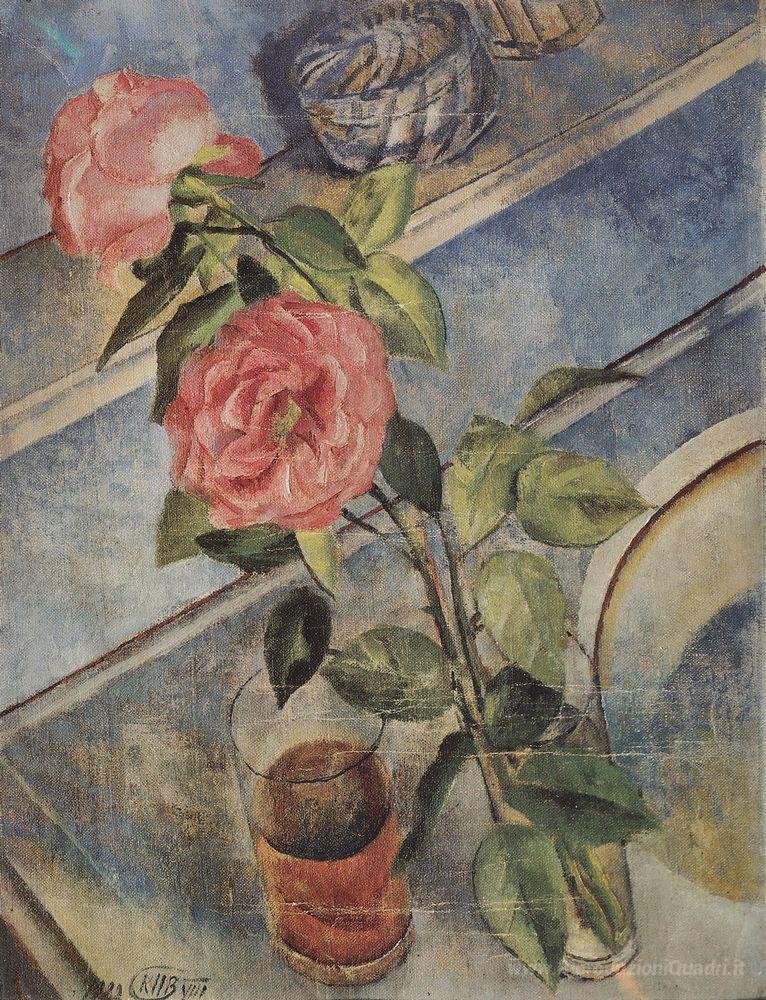 Ti offriamo una riproduzione artigianale su tela dell'opera famosa 'Natura morta con rose' di Kuzma Petrov-Vodkin, dal Museo delle Riproduzioni.