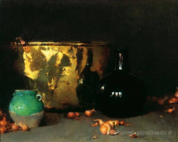 Ti offriamo una riproduzione artigianale su tela dell'opera famosa 'Natura morta con un bollitore in ottone' di Emil Carlsen, dal Museo delle Riproduzioni.
