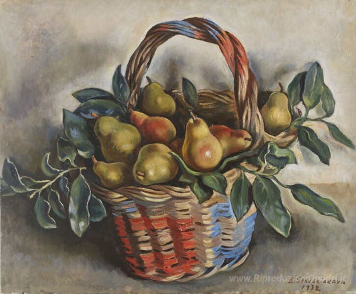 Ti offriamo una riproduzione artigianale su tela dell'opera famosa 'Natura morta con un cesto di pere' di Zinaida Serebriakova, dal Museo delle Riproduzioni.