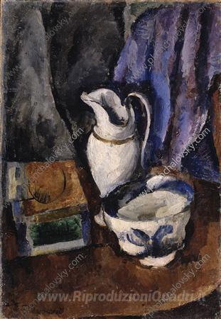 Scoprite l'incanto della tradizione artistica italiana attraverso i dipinti a olio di rinomati artisti. In particolare, vi presentiamo l'opera Natura morta con una brocca dell'illustre artista russo Pyotr Konchalovsky, il quale, con il suo stile distintivo, ha saputo coniugare influenze europee e una profonda passione per la bellezza della natura. La sua creazione si distingue per l'uso sapiente della luce e dei colori, che conferiscono al dipinto un'aura vibrante e coinvolgente.