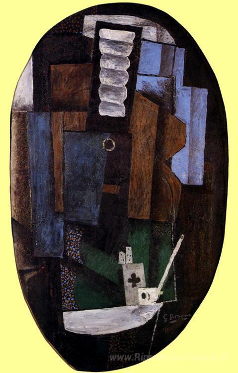 Ti offriamo una riproduzione artigianale su tela dell'opera famosa 'Natura morta con una chitarra su un tavolo' di Georges Braque, dal Museo delle Riproduzioni.