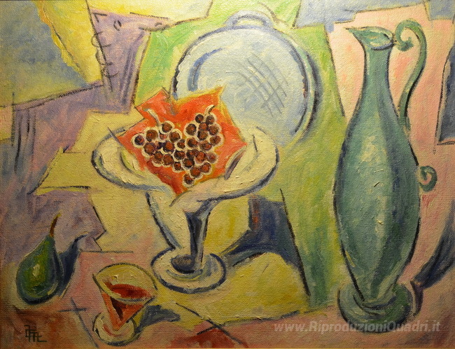 Ti offriamo una riproduzione artigianale su tela dell'opera famosa 'Natura morta con uva e Caraffa' di Corneliu Michailescu, dal Museo delle Riproduzioni.