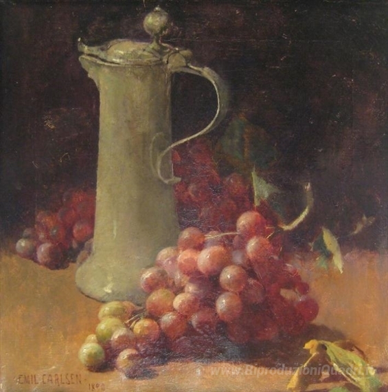 Ti offriamo una riproduzione artigianale su tela dell'opera famosa 'Natura morta con uva e peltro bottiglione' di Emil Carlsen, dal Museo delle Riproduzioni.