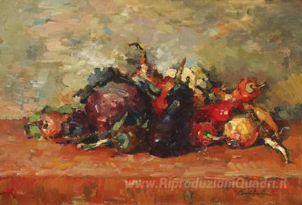 Ti offriamo una riproduzione artigianale su tela dell'opera famosa 'Natura morta con verdure' di Adam Baltatu, dal Museo delle Riproduzioni.