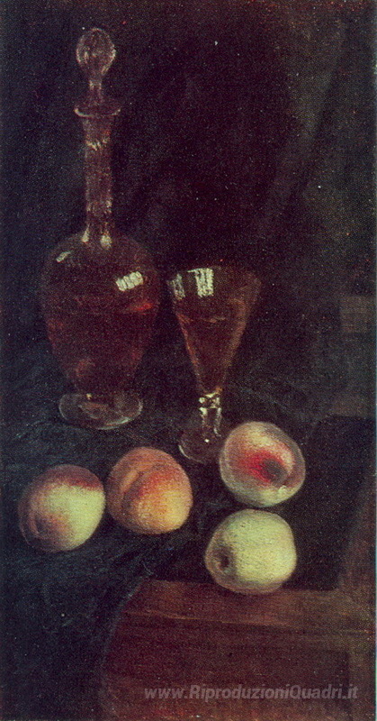 Ti offriamo una riproduzione artigianale su tela dell'opera famosa 'Natura morta. Decanter e pesche' di Ilya Mashkov, dal Museo delle Riproduzioni.
