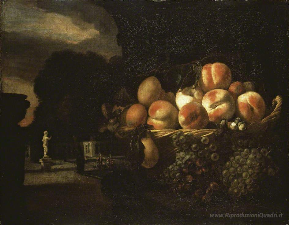Ti offriamo una riproduzione artigianale su tela dell'opera famosa 'Natura morta di frutta in un giardino formale' di Nicolaes Maes, dal Museo delle Riproduzioni.