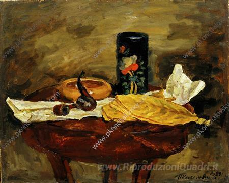 Ti offriamo una riproduzione artigianale su tela dell'opera famosa 'Natura morta. Foglie di tabacco e nero tea caddy.' di Pyotr Konchalovsky, dal Museo delle Riproduzioni.