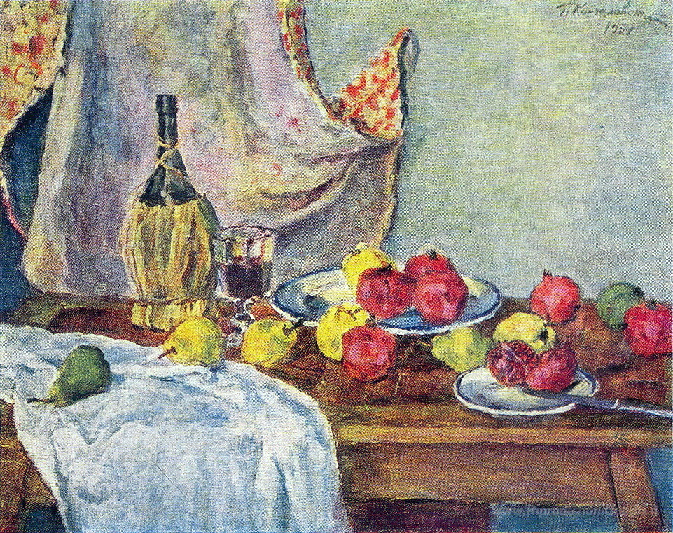 Ti offriamo una riproduzione artigianale su tela dell'opera famosa 'Natura morta. Granate.' di Pyotr Konchalovsky, dal Museo delle Riproduzioni.