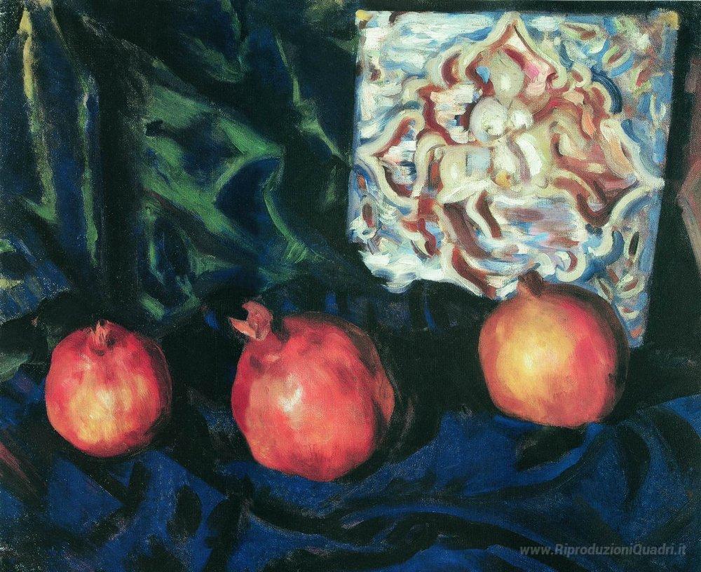 Ti offriamo una riproduzione artigianale su tela dell'opera famosa 'Natura morta. Granate' di Boris Kustodiev, dal Museo delle Riproduzioni.