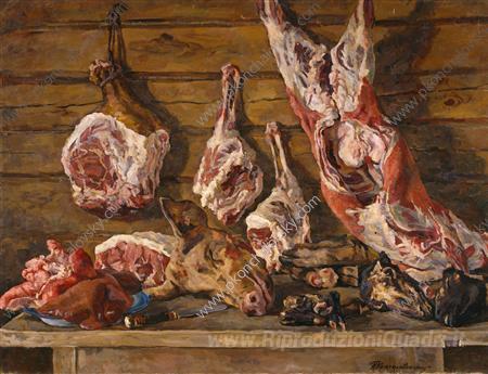 Ti offriamo una riproduzione artigianale su tela dell'opera famosa 'Natura morta. La carne.' di Pyotr Konchalovsky, dal Museo delle Riproduzioni.