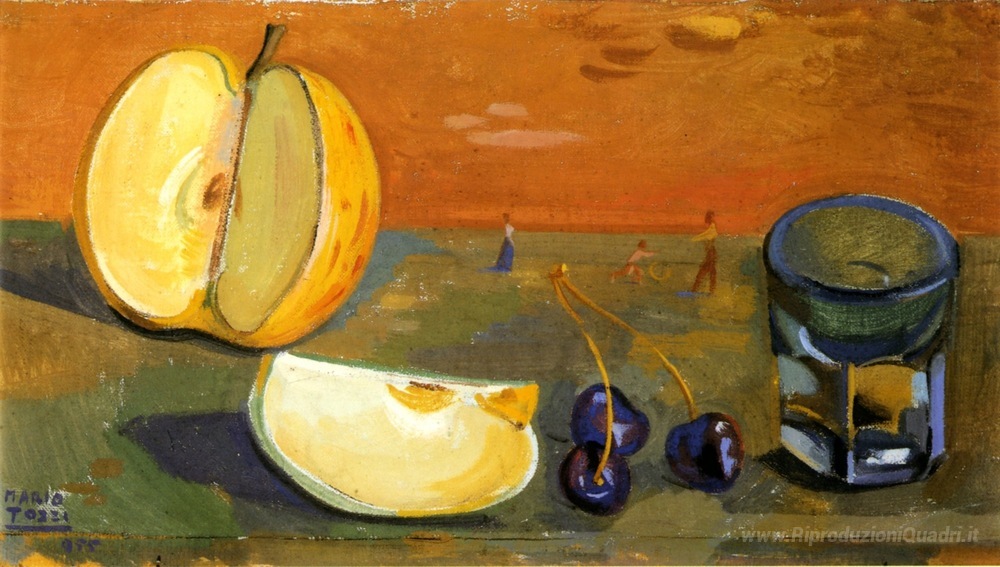 Ti offriamo una riproduzione artigianale su tela dell'opera famosa 'Natura Morta' di Mario Tozzi, dal Museo delle Riproduzioni.