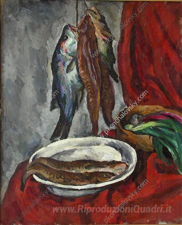 Ti offriamo una riproduzione artigianale su tela dell'opera famosa 'Natura morta. Pesce.' di Pyotr Konchalovsky, dal Museo delle Riproduzioni.