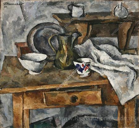 Ti offriamo una riproduzione artigianale su tela dell'opera famosa 'Natura morta. Tabella con i piatti.' di Pyotr Konchalovsky, dal Museo delle Riproduzioni.