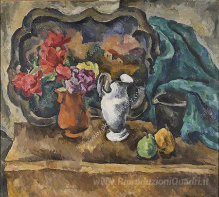 Ti offriamo una riproduzione artigianale su tela dell'opera famosa 'Natura morta. Vassoio e fiori.' di Pyotr Konchalovsky, dal Museo delle Riproduzioni.