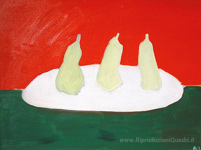 Ti offriamo una riproduzione artigianale su tela dell'opera famosa 'Nature morte, poires, fond vert et orange' di Nicolas de Staël, dal Museo delle Riproduzioni.