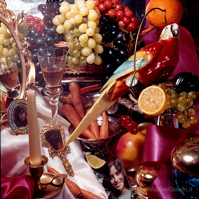 Ti offriamo una riproduzione artigianale su tela dell'opera famosa 'Pappagalli Live Forever' di Audrey Flack, dal Museo delle Riproduzioni.