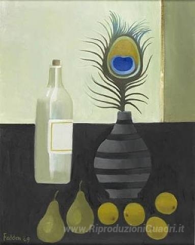 Ti offriamo una riproduzione artigianale su tela dell'opera famosa 'Peacock Feather Still Life' di Mary Fedden, dal Museo delle Riproduzioni.
