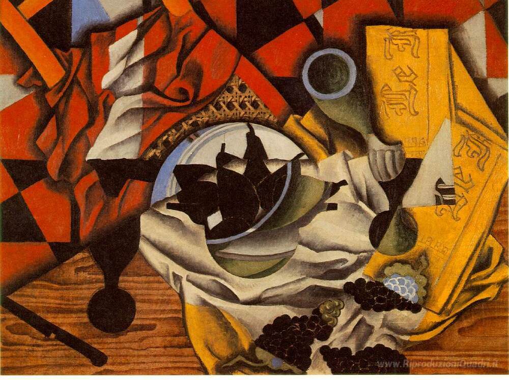 Ti offriamo una riproduzione artigianale su tela dell'opera famosa 'Pere e uva su un tavolo' di Juan Gris, dal Museo delle Riproduzioni.