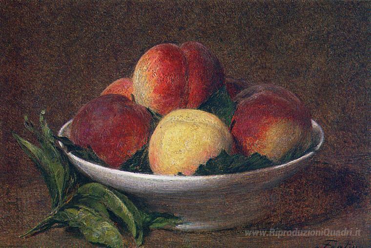 Ti offriamo una riproduzione artigianale su tela dell'opera famosa 'Pesche in una ciotola' di Henri Fantin-Latour, dal Museo delle Riproduzioni.