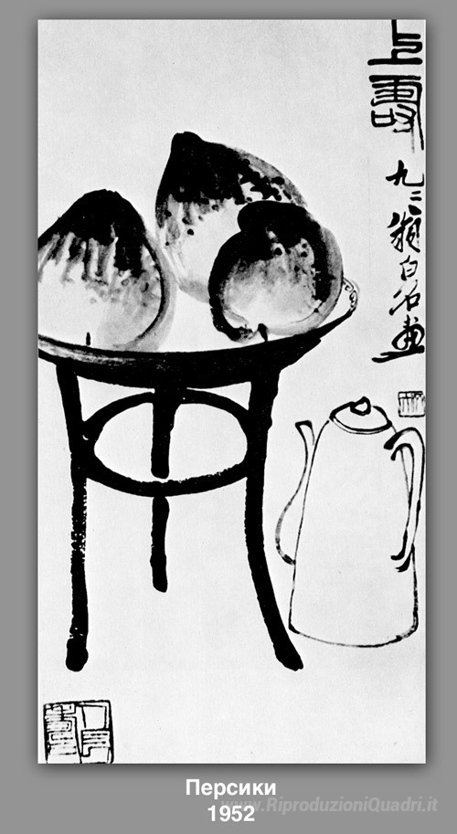 Benvenuti nella nostra esclusiva selezione di dipinti a olio italiani, dove l'arte si fonde con l'eleganza e la tradizione. Oggi vi presentiamo un'opera straordinaria: Pesche, realizzata dal celebre artista Qi Baishi. Rinominato per il suo approccio innovativo e il profondo rispetto per la natura, Baishi riesce a catturare l'essenza della vita attraverso i colori vibranti e le forme armoniose.