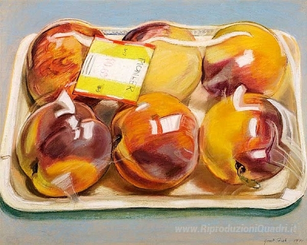 Ti offriamo una riproduzione artigianale su tela dell'opera famosa 'Pesche' di Janet Fish, dal Museo delle Riproduzioni.