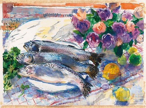 Ti offriamo una riproduzione artigianale su tela dell'opera famosa 'Pesci, fiori e frutta' di Samuel Buri, dal Museo delle Riproduzioni.