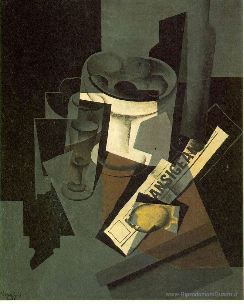 Ti offriamo una riproduzione artigianale su tela dell'opera famosa 'Piatto di frutta, vetro e limone (Natura morta con nerwspape)' di Juan Gris, dal Museo delle Riproduzioni.