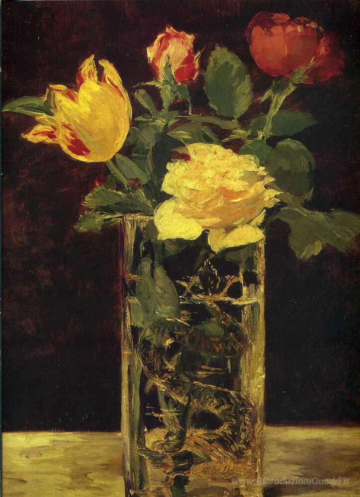 Ti offriamo una riproduzione artigianale su tela dell'opera famosa 'Rose e tulipani' di Edouard Manet, dal Museo delle Riproduzioni.
