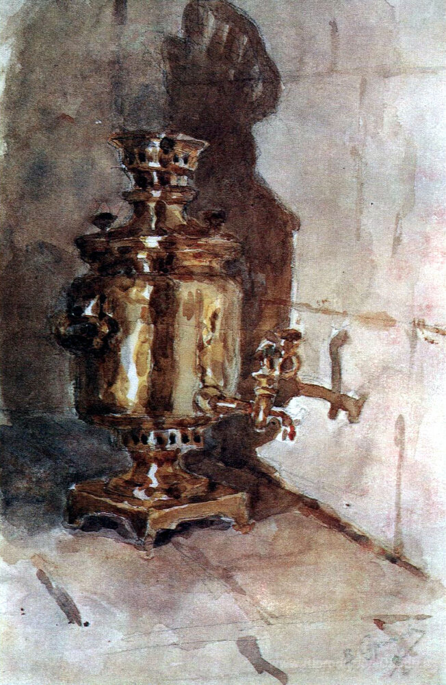 Ti offriamo una riproduzione artigianale su tela dell'opera famosa 'Samovar' di Vasily Surikov, dal Museo delle Riproduzioni.