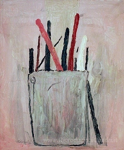 Ti offriamo una riproduzione artigianale su tela dell'opera famosa 'Spazzole' di Philip Guston, dal Museo delle Riproduzioni.