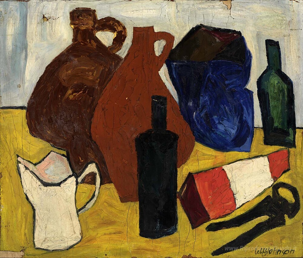 Questo dipinto, con la sua attenzione ai dettagli e l'uso sapiente delle forme, non è solo un oggetto decorativo, ma un pezzo d'arte che arricchisce ogni spazio, creando un'atmosfera calda e accogliente. Perfetto per il soggiorno o la cucina, Still Life - bottiglie, brocche, Pitcher di William H. Johnson trasforma ogni ambiente in un luogo di bellezza ispiratrice, dove l'arte diventa parte integrante della quotidianità.