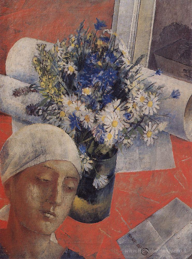 Ti offriamo una riproduzione artigianale su tela dell'opera famosa 'Still Life (con una testa femminile)' di Kuzma Petrov-Vodkin, dal Museo delle Riproduzioni.