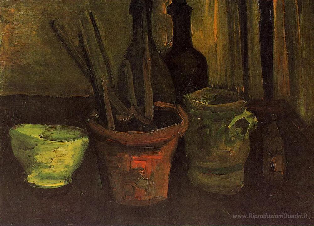 Ti offriamo una riproduzione artigianale su tela dell'opera famosa 'Still Life di pennelli in un vaso di fiori' di Vincent van Gogh, dal Museo delle Riproduzioni.
