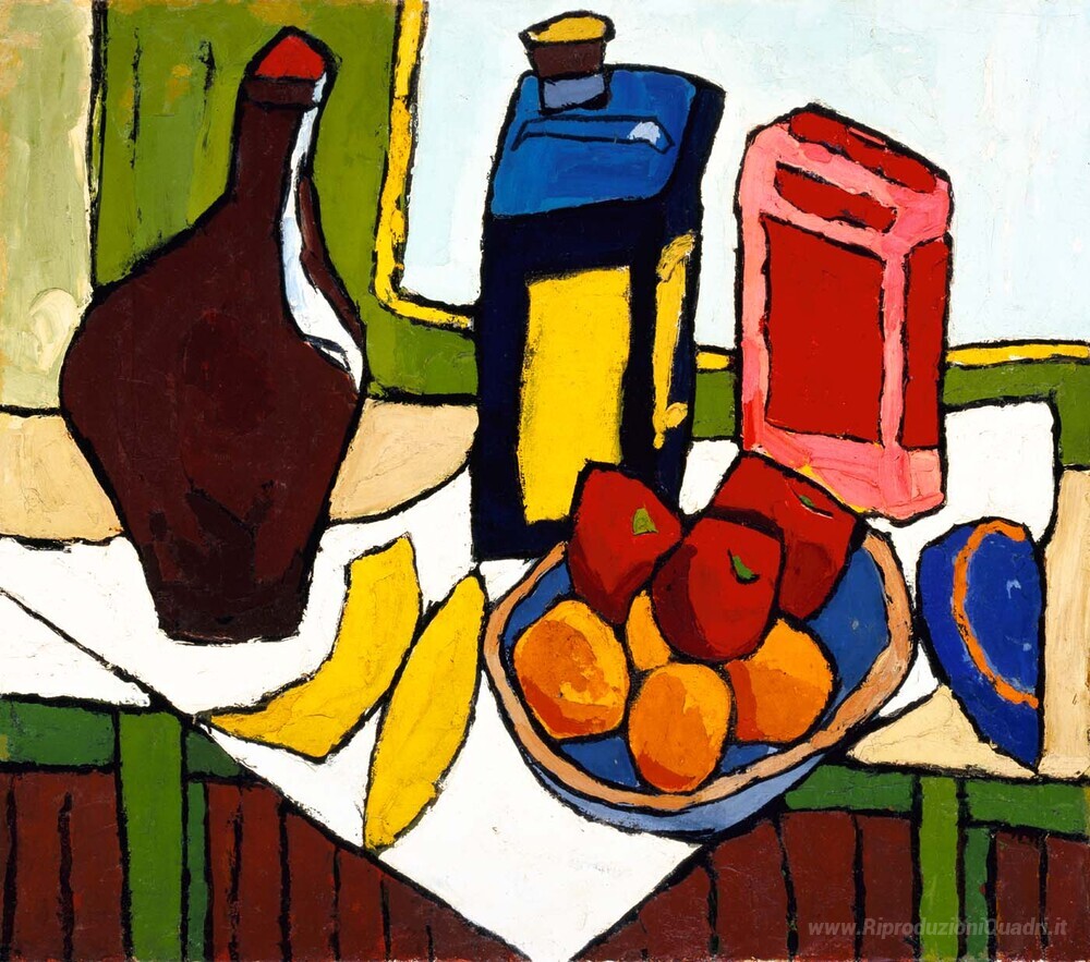 Ti offriamo una riproduzione artigianale su tela dell'opera famosa 'Still Life - frutta, bottiglie' di William H. Johnson, dal Museo delle Riproduzioni.