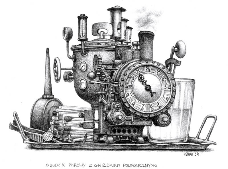 Ti offriamo una riproduzione artigianale su tela dell'opera famosa 'Sveglia vapore con un fischio polifonica' di Jacek Yerka, dal Museo delle Riproduzioni.
