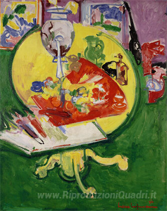 Ti offriamo una riproduzione artigianale su tela dell'opera famosa 'Tabella gialla sul verde' di Hans Hofmann, dal Museo delle Riproduzioni.