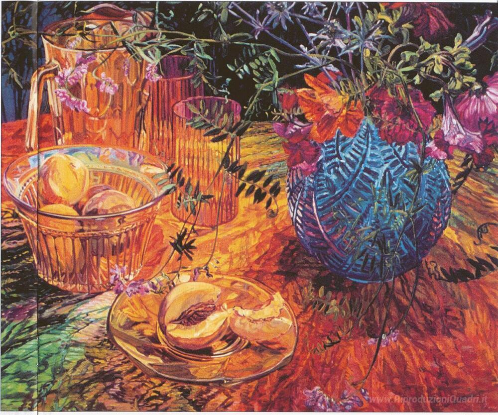 Ti offriamo una riproduzione artigianale su tela dell'opera famosa 'Tagliare pesca, vaso blu' di Janet Fish, dal Museo delle Riproduzioni.