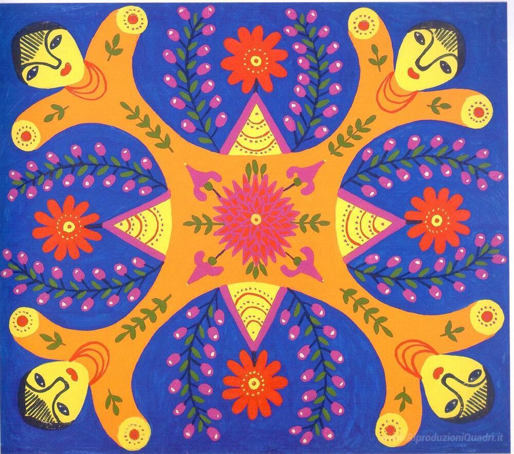 Ti offriamo una riproduzione artigianale su tela dell'opera famosa 'Tovaglia' di Maria Primachenko, dal Museo delle Riproduzioni.